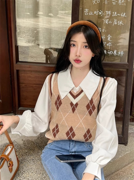 French-style Vintage White Polo-collar Long-sleeve Shirt